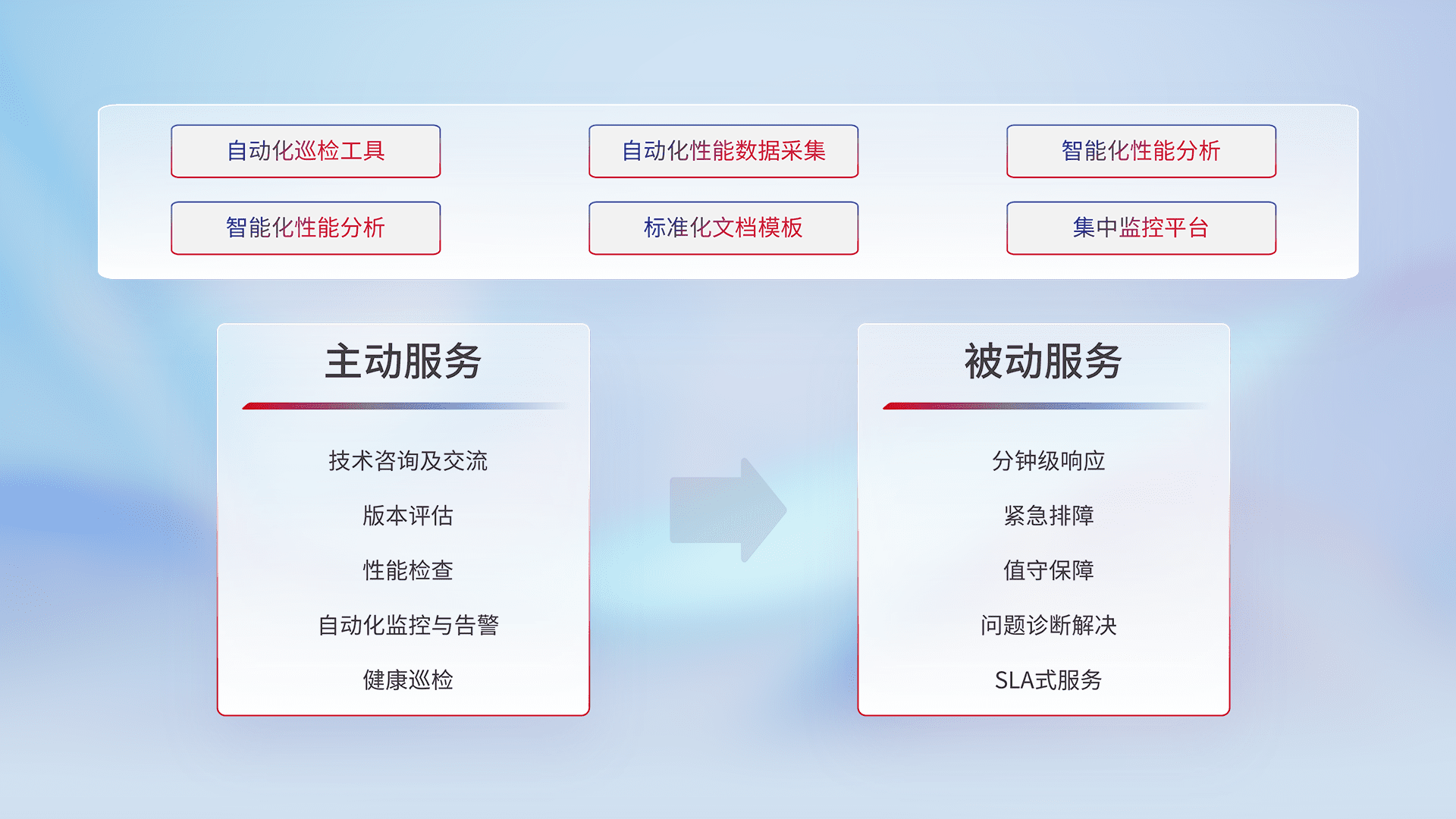 智能化工具和标准化文档,,,保障服务质量,,,,提供主动服务(包含技术咨询、、、版本评估、、、、性能检查、、、、自动化监控与告警、、、、健康巡检)和被动服务包含(分钟级响应、、、、紧急排障、、、、值守保障、、问题诊断解决、、、、SLA服务)。。。。